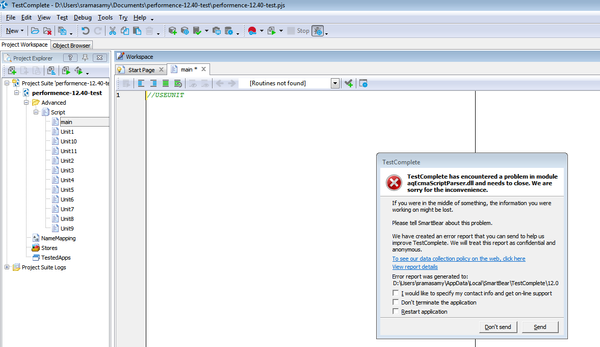 Yes i tried to do that, now i'm getting crash :smileyfrustrated: as like https://community.smartbear.com/t5/TestComplete-Desktop-Testing/TestComplete-version-12-40-crashes-when-loading-JavaScript/m-p/151258#M10650 when i type //USEUNIT and type a space.