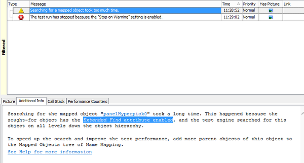 In your case, while you're trying to click on the button, that "finding" process bogged down on one of the parent objects (in my example, my warning would come up with "took too much time" on my Table0, not on buttonSave). so... what I would do would be to edit your namemapping and insert a parent object in your tree before panelHyperpick0.