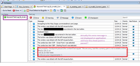 Try converting your KeywordTest into a script and look at what you're using for the comparison text in the Property checkpoint.