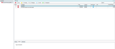 Then I run the test it fails, when it gets to the step where it should click on the button after I changed from "..." to the variable the error details say: "Exception. Type mismatch".