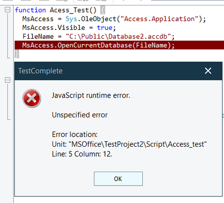When I'm trying to open database using OpenCurrentDatabase method - I'm getting error. I need to test forms. Not change DB. Check functionality of the form. Code:     function Acess_Test() { ...
