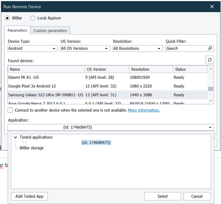 I've uploaded a tested application in TestComplete and made sure it was also uploaded in Bitbar. I checked for the tested application when I update the run remote device, the app in the Bitbar Storag...