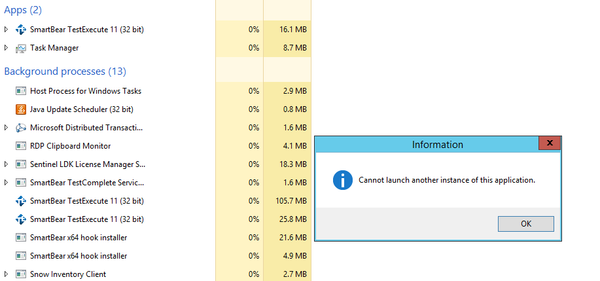 If I manually trigger TestExecute after a Task has called it, it starts again and you have two instances shown in Task Manager. If you again manually start testexecute, it produces a box stating you cannot launch it again.