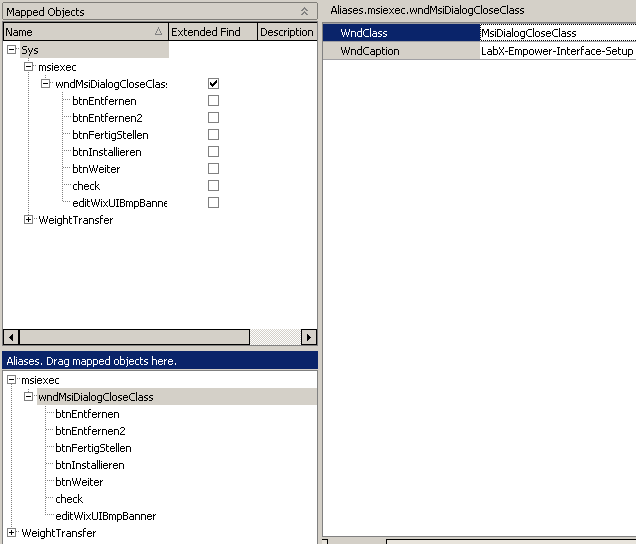 I can see the the installer process in NameMapping on Mapped Objects and Aliases, but havn't touched Aliases just to be sure. I can even highlight the installer with left click, even though the test failed beforehand. So TestCompelte sees it, but during a test run it doesn't. I've added delays of 10 secons, but even that isn't saving the test from failing.