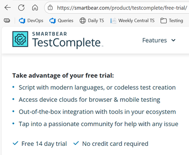 It mentions "Free 14 day trial" in https://smartbear.com/product/testcomplete/free-trial/