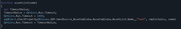 aqObject.CheckProperty( Aliases.GDP.HwndSource_AssetsWindow.AssetsWindow.AssetList.WPFObject("ListViewItem", "", row).WPFObject("ContentPresenter", "", 2).WPFObject("Name"),"Text", cmpContains, name)in this code I am only manipulating the "row" and "Name" is the column header