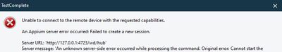 The URL for Appium given is http://127.0.0.1:4723/wd/hub