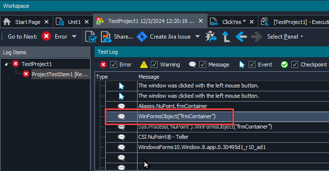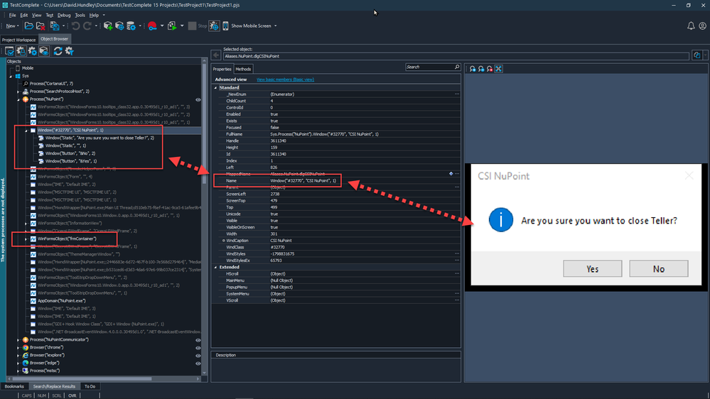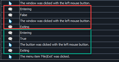 i put some Log.Message statements in to show what's happening. When the Click action on the File | Exit menu is impeded because of the modal window the event hander is triggered. The If statement on line 17 checks to see if the unexpected window is a message popup box. If it is not, then it will assign the message popup box to the Window parameter and then click right in the middle of it to make it the active control on the screen. at that point i think it is going back and trying to Click File | Exit again. it is still impeding but the second time the event handler gets triggered the Window parameter is now equal to model window object and the Yes button is clicked. Here's the results log showing how this event handler was executed. The first window click was closing the Teller tab. The second window click in the red box is in the middle of the pop up during the first traversal of the event handler and then the button click is on the Yes button of the pop up and finally the File | Exit is clicked and the test case was successful. It's a bit of a roundabout way of doing it but it does seem to work.