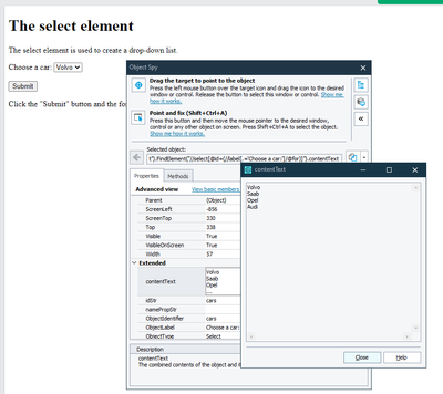 def findChild(): #navigate to the w3c example page Browsers.Item[btChrome].Navigate("https://w3c.github.io/aria-practices/examples/combobox/combobox-select-only.html") browser = Aliases.browser #click on the comboBox to open it for child object detection browser.pageSelectOnlyComboboxExampleWai.labelCombo1Label.panelFavoriteFruit.Click() #spy the entire comboBox and create a variable that hold the comboBox object itself box = Aliases.browser.pageSelectOnlyComboboxExampleWai.FindElement("#listbox1") #search through all the Child objects of the comboBox and click on one that has Apple as the contentText child = box.Find("contentText", "Apple", "10") child.Click()And here is the document for the 'Find' method;