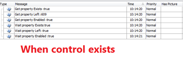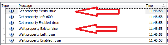 Log.Message("Get property Exists :" + this.btn.Exists) Log.Message("Get property Left :" + this.btn.Left) Log.Message("Get property Enabled :" + this.btn.Enabled) Log.Message("Wait property Exists:" + this.btn.WaitProperty("Exists", true, 0)) Log.Message("Wait property Left :" + this.btn.WaitProperty("Left", 609, 0)) Log.Message("Wait property Enabled :" + this.btn.WaitProperty("Enabled", true, 0))