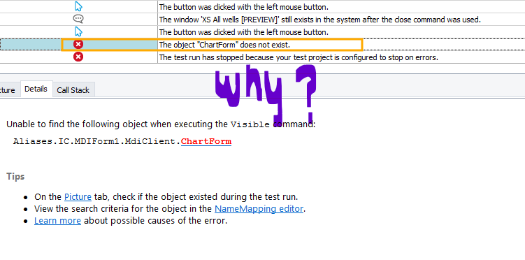 When the while loop found the value to false it just said the object is not Visisble so it return false, but it stopped teh test because its flase. I though it should break out of the while loo and to the IC > MDIForm etc etc (next steps)