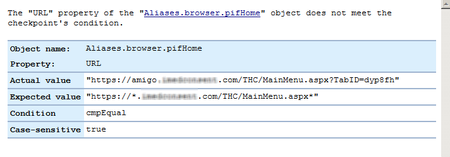 Trying to confirm a page/url, as in -   aqObject.CheckProperty(Aliases.browser.pifHome, "URL", cmpEqual, "https://*.mydomain.com/THC/MainMenu.aspx*"); I am getting "The "URL" property of the "Alia...