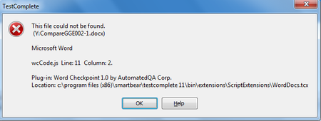 You're using the JScript/JavaScript function format. In that format, when doing file paths, the backslash character (\) in a string is used for other functionality. In order for it to resolve as an actual backslash, you need to double it up. Change your code to the following:function Main () { WordDocs.Compare("Y:\\Compare\\GGE002-1.docx", "Y:\\Compare\\GGE002-2.docx",2); }