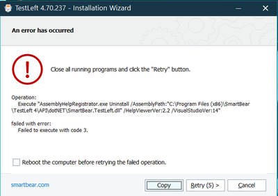 Issue solved after checked the checkbox 'Reboot the computer before retrying the failed operation'.