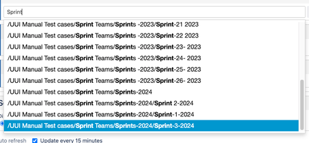 In the Dashboard, I Select a Gadget and try to Select the Specific Sprint folder from the Dropdown. But I can only see until Sprint 3 subfolders