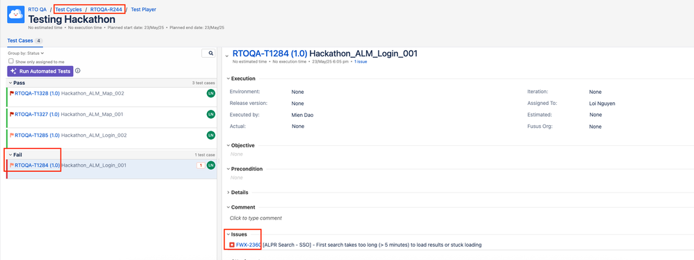 While executing the test cases within the test cycle, I encountered a bug and attached a Jira issue to the relevant test case, marking the test status as Failed.
