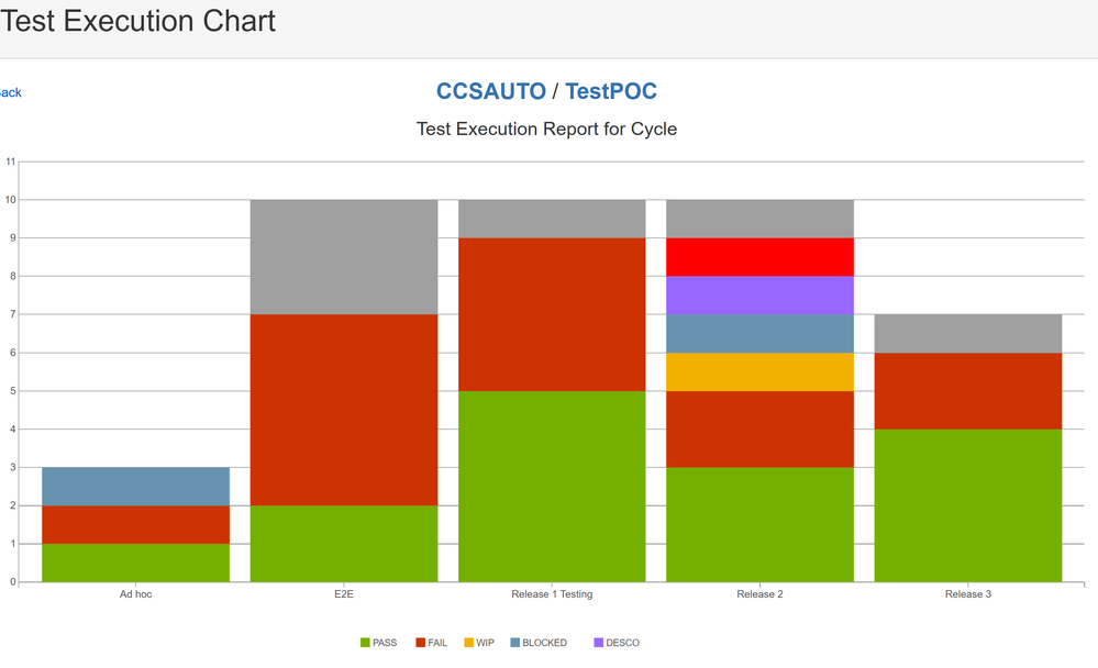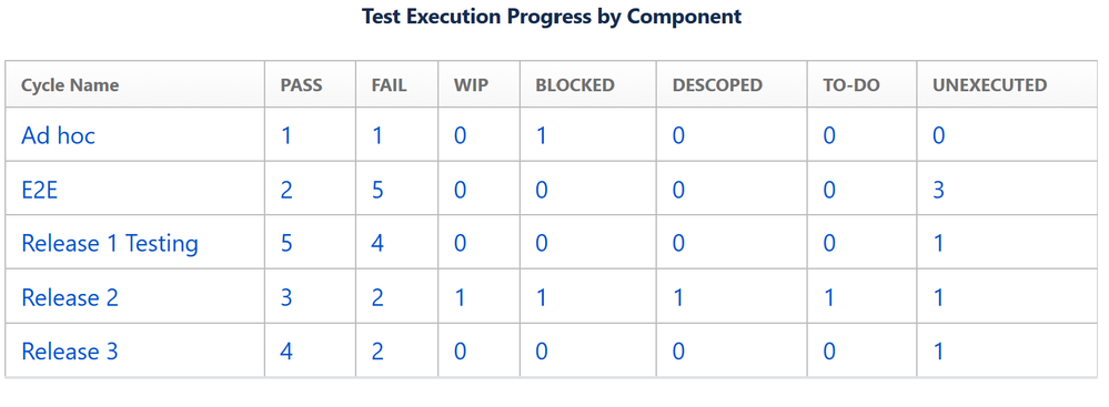 I am trying to get Total test cases for all cycles as overall and its % completion and % execution in gadget as count or as matrix table. The Zephyr graph below shows testcases but its grouped by cycle or components. I want to show overall % for test execution and test completion (for single version TestPOC)