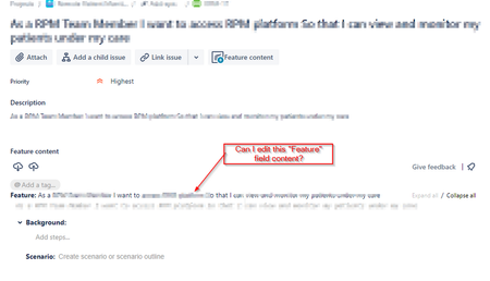 Yes, if you edit the BDD Story summary, the same content will be updated as the Feature title content. Under the Feature, you can edit the Background and add Scenarios.