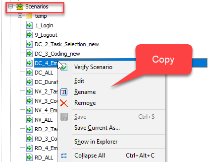 Provide option to Copy (and Paste) Scenarios. Selecting Copy (option to be added in the context menu) copies selected test to memory. Pasting them (option to be added in the context menu), pa...