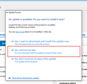 mgroen2Super Contributor10 years agoStatus: New Idea(another) Improvement on TestComplete/ TestExecute update process When you start TestComplete or TestExecute, it checks for available updates. When there are updates found it displays message, something like this: If you click on "No, remind...Show More