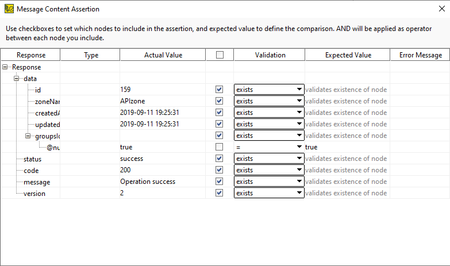 I'm doing comparison of values in Oracle database on one end and the service at the other. There are attributes which return NULL value and those same attributes are not found in the service response when this is the case. I need an assertion in the REST request that will pass this scenario, but the regular assertions do not work. When I try to assert these, I get the following error: Comparison failed. Path: [$['list'][0]['firstLevelNode'][0]['attributeName']]; Expected value: []; Actual value: []. Expected value is the attribute from the JDBC Request and the Actual value is the corresponding attribute from the REST request. As you can see, the responses are the same, but the assertion does not pass. Is there a way to bypass this? Thanks. EDIT: I know this can be done with a Groovy script, but I would really prefer a solution with assertions inside the REST request.1.9KViews0likes5CommentsMessage Content Assertion: Assertion is looking for null fields even though it worked previously