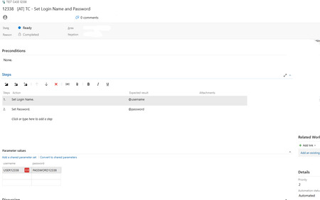 Hi, We are using on-prem DevOps Server 2020 Update 1.2 and Test Complete 15.81.7. I have created a simple Test Case in DevOps: That is supposed to pass the username and password to an automated test in Test Complete. The Test Case has a linked automated test in Test Complete and is run via a teat Suite / Test Plan and a pipeline. Does any one know how to get the parameters defined in the Test Case passed to Test Complete? Many Thanks Dave2Views0likes0CommentsQT - Error No such interface supported
