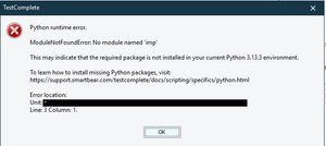 I have followed the documentation from following link: https://support.smartbear.com/testcomplete/docs/scripting/specifics/python.html I followed step by step; to install libraries to TestComplete python interpreter to the source folder: "...SmartBear\TestComplete 15\Bin\Extensions\Python\Python313\Lib". After closing TestComplete and opening it again, the interpreter is not being refreshed; not getting the newly added libraries I installed. It keeps throwing me an error as follows: ModuleNotFoundError: No module named 'imp'. The imported library I'm trying to use is a customized file with multiple classes. However, it does also happen for win23com.client and pillow libraries. import win32com.client from PIL import ImageGrab This seems to be an error with python 3.13, but I do not find a way to downgrade the python interpreter version from TestComplete. I do not find a way to fix this even after following documentation on how to install packages, either. Would appreciate your help on this, Thanks13Views0likes1CommentRuntimeErrors after upgrading to 15.68.8.7