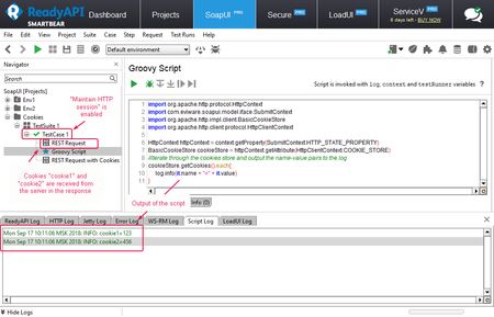 Hi Community, Let me share an answer to the above question with you 🙂 If the Session option is enabled, ReadyAPI maintains the HTTP session on the TestCase level automatically, which means that it stores cookies received from the server and sends them back in the subsequent requests to the same endpoint. If you need to get programmatic access to the stored cookies, you can use this Groovy script (it's applicable to ReadyAPI v.1.7.0 and later): import org.apache.http.protocol.HttpContext import com.eviware.soapui.model.iface.SubmitContext import org.apache.http.impl.client.BasicCookieStore import org.apache.http.client.protocol.HttpClientContext HttpContext httpContext = context.getProperty(SubmitContext.HTTP_STATE_PROPERTY) BasicCookieStore cookieStore = httpContext.getAttribute(HttpClientContext.COOKIE_STORE) //iterate through the cookies store and output the name-value pairs to the log cookieStore.getCookies().each{ log.info(it.name + "=" + it.value) } Example:3.8KViews7likes0CommentsTesting approach Business logic - Scenarios as TCs in Excel Use Groovy to run these TCs